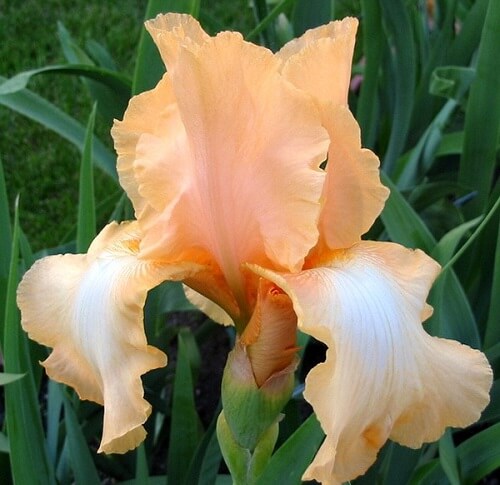 Многолетний ирис Aphrodisiac абрикосово-креветочной окраски с перламутровым отливом на нижних долях. Бородка креветочная.