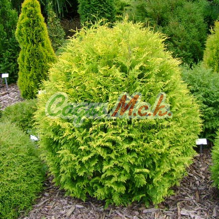 Семена туи западной Stolwijk, миниатюрного вечнозеленого кустарника, можно приобрести в нашем профессиональном питомнике. 10-летнее растение достигает 1 м в высоту. Туя формирует сначала крону в виде купола, но с возрастом она больше напоминает ассиметричный конус. Снизу ветви чуть разрежены, сверху они расположены плотнее. Старая хвоя чешуйчатая, насыщенного зеленого оттенка, а вот молодой прирост – лимонный. Крупномер западный Stolwijk предпочитает солнечные участки, в тени крона становится рыхлой, теряет декоративность. Сорт морозостоек, но плохо переносит жару. В период засухи кустарник нужно поливать и проводить дождевание.